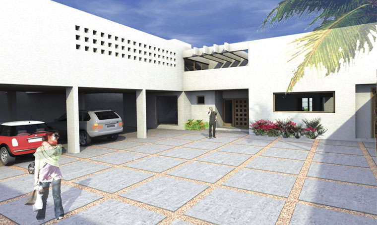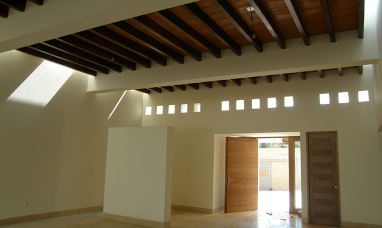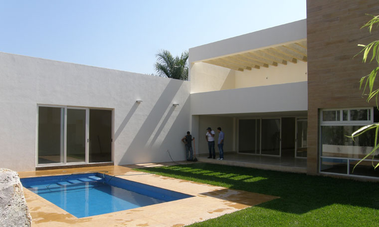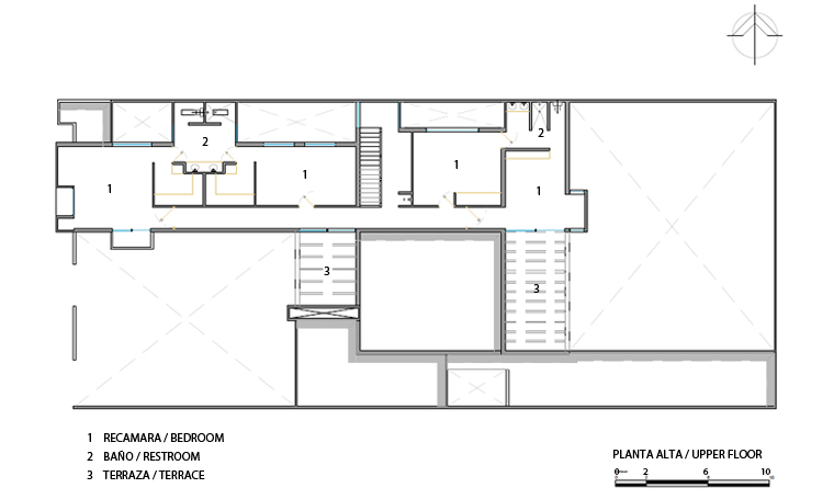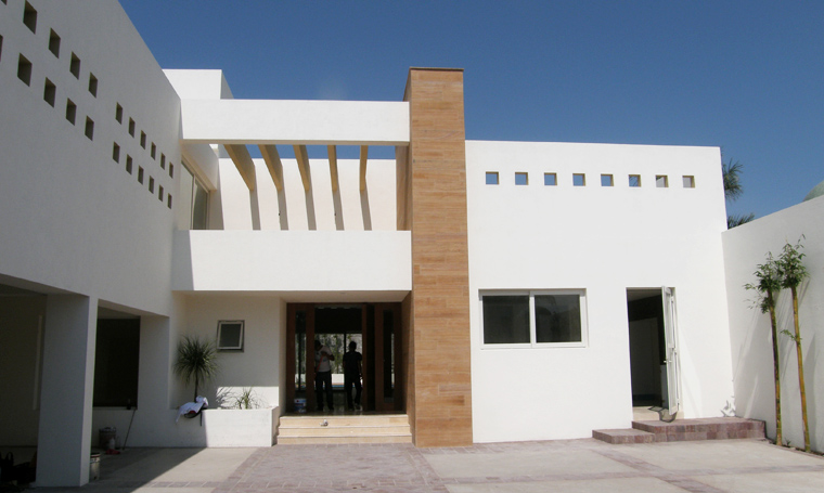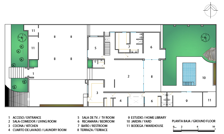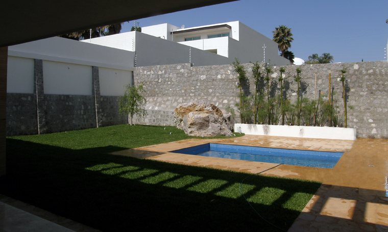 The house is built on a 20x50 m land plot, located at the north of the City of Leon. An axial and translucent axis was designed, which goes over several spaces, from the access to the backyard. The service areas are placed in the south box allowing a double-height salon at the center, with a great view of the garden and swimming pool. The guest and the TV room are located at the north of the salon. The upper floor is within another superimposed box at the north of the plot, benefiting the bedrooms with a south orientation. These four bedrooms share a couple of bathrooms and have a direct access to the de balcony facing the main entrance and garden. A service hallway at north of the basement floor connects the main entrance and backyard without entering any of the interior spaces