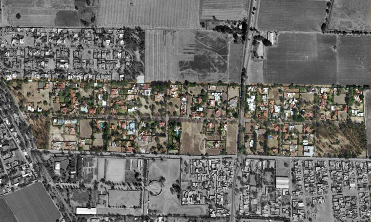 This house development was one of the initial country residential complexes built in the city. It is located at west of Leon with the main access from Blvd. La Luz. The land plot has a long proportion surface, about 200m wide and 1km deep. The planning design intended to establish an orthogonal scheme alongside east and west boundaries, generating the most favorable, northeast and southwest, bearing. The main boulevard works as the central structure for the whole journey. The 100m wide blocks, divided into 1,000 sm (20x50m) allow sales flexibility when fusing one or more plots. The entire development featured wide paved natural stone roads and sidewalks, providing a most pleasant suburban environment, for country living feeling was the main sale premise in spite of the proximity to the city.