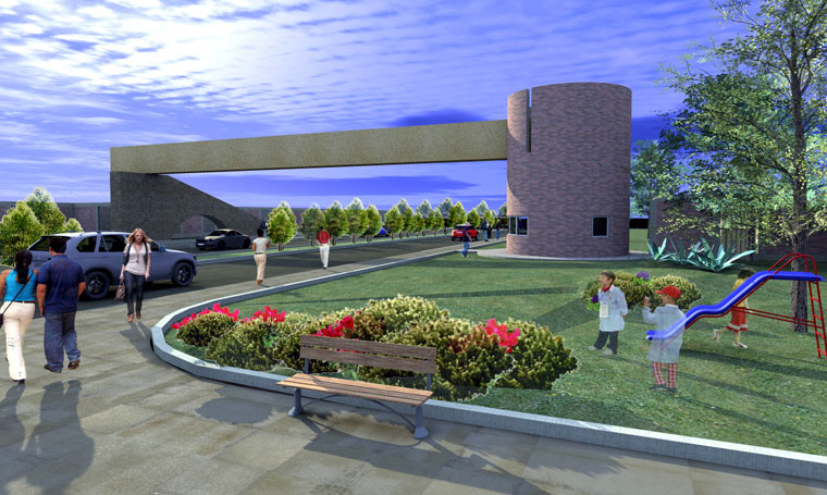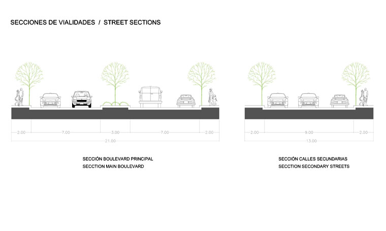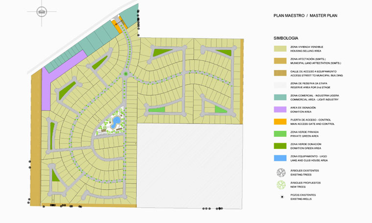 The design for the master plan of this residential suburban development of 60 hectares located to the south of León had a first proposal which propose a main “green belt” creating an organic circuit from which you can access to each of the internal housing clusters. The final master plan leaves a reserve area and develops only two third parts of the area. One new “green heart” is located at the center with an artificial lake and the club house. All the housing clusters have a green community area, there is also a commercial strip at the north and the donation area for the municipality is located at the northwest end. The main access to the complex is done by a gate which tries to create visual impact and lightness with a few elements and apparent materials of low maintenance.