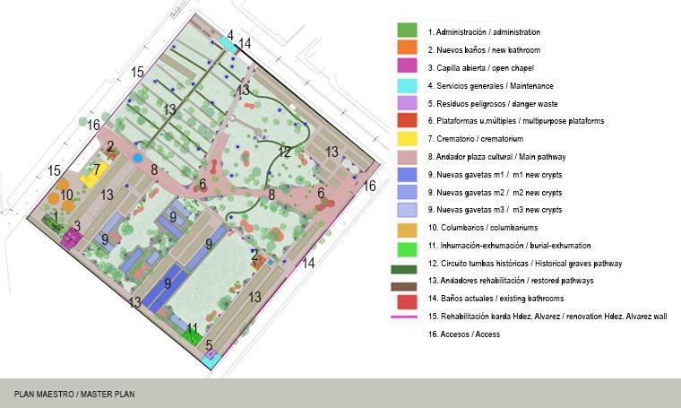 Plan Maestro de renovación del histórico panteón San Nicolás ubicado al sur del Centro Histórico de León. La propuesta consistió en además de dignificar las construcciones, andadores existentes y generar los nuevos espacios requeridos para su mejor funcionamiento dotar de espacios adicionales para nuevas actividades como las culturales y artísticas abiertas a todo público, transformando completamente su uso diario. Se genera un recorrido a través de las 27 tumbas de personajes históricos que yacen en este lugar para fomentar el arraigo y el conocimiento de sus vidas en la población. Se propone un nuevo acceso así como nuevos edificios que incluyen módulos de servicios, oficinas administrativas y de servicios generales, una capilla abierta, salas de velación, espacio cultural de exposiciones y eventos así como el tratamiento de las bardas perimetrales con los murales artísticos del día de muertos.